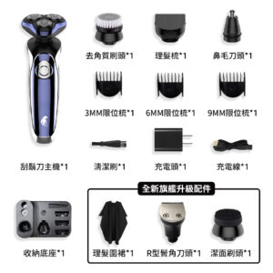 3款限位梳(3.6.9分)、充電底座、USB充電線、旅充頭、清潔油